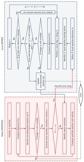 The proposed global/local hybrid algorithm is based on a multi-objective deterministic version of the particle swarm optimization [] and on the derivative-free multi-objective local searches algorithm []. The following subsections present the global and local algorithms and finally the hybridization proposed.