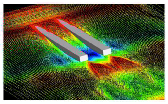 The problem was solved by means of stochastic radial-basis function (SRBF) interpolation [] of high-fidelity unsteady Reynolds-averaged Navier–Stokes (URANS) simulations (CFDShip-Iowa v4.5 []). Further details on design variables, objective functions, constraints, and conditions can be found in []. A snapshot of the catamaran behavior in irregular head waves computed by the URANS solver is shown in Figure 4.