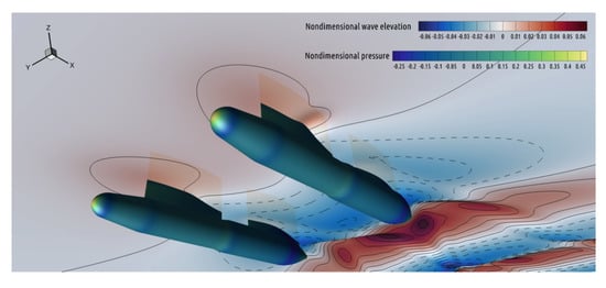 The hydrodynamic resistance was evaluated by an adaptive multi-fidelity SRBF metamodel [] trained with high-fidelity URANS (navis []) and low-fidelity potential flow (WARP []) solvers. Further details on design variables, objective functions, constraints, and conditions can be found in []. Figure 5 shows non-dimensional pressure distribution on the SWATH torpedoes and wave elevation for the original geometry by potential flow simulation.