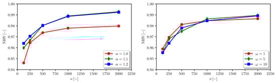 Figure 6 shows the NHV metric versus the budget of problem evaluations. Average values are presented, conditional to the local search activation parameter (Figure 6 left) and deepness parameter (Figure 6 right). It can be noted how MODHA effectiveness improves by using higher values of , meaning that the hybrid formulation is pushed to exploit local searches capability and its effectiveness is enriched by global exploration only if a significant improvement of the HV is achieved between iterations (i.e., the global exploration improves the algorithm performance if the HV improves by 10–20% between MODHA iterations). Considering the deepness parameter , the use of a low number of local search (, at each DFMO call) is more effective when a low computational budget is available. On the contrary (using higher budgets), the “deeper” is the local search, the greater is the effectiveness of the hybrid formulation.