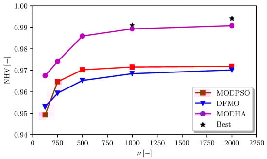 The MODHA performance is summarized in Table 2. For each budget of problem evaluations, the NHV mean values are provided along with standard deviations. Furthermore, budget-averaged performance is also provided. The hybridization scheme with and is the most effective on average, providing the highest NHV with the lowest standard deviation, in accordance with results shown in Figure 6.