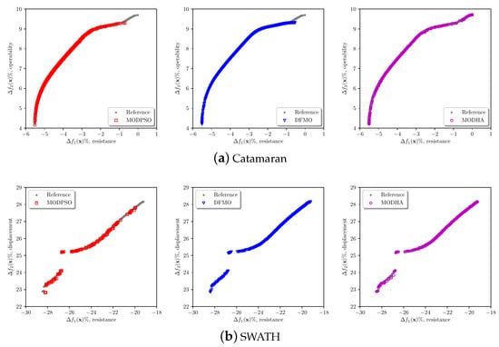 Four design variables () control the catamaran hull global modifications, based on the Karhunen–Loève expansion (KLE) of the shape modification vector [] based on free-form deformation. Further details can be found in []. The reference non-dominated solution set is taken from [].