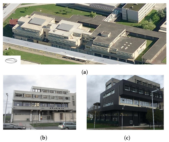 (a) View of the whole rectorate building that is formed by three blocks (west, central and east). This work focussed in the study of the retrofitting measures carried out in the west block. (b) West block before retrofitting. (c) West block after retrofitting.