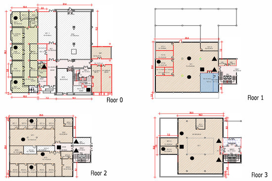 Plans of the four floors in the west block of the building with their space distribution and dimensions. The use of each space is represented with colours: offices (brown), nursery (green), storage rooms (grey), corridors (pink) and server room (blue). In addition, the distribution of the sensors is also displayed: circles, illuminance, temperature and relative humidity; triangles, calorimeters; and square, lighting consumption.