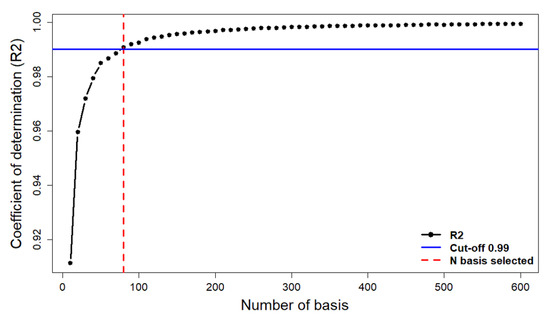 Example of the process of selecting the optimum number of basis for smoothing the original sample. The red line represents the minimum number of basis where the R2 is higher than 0.99.