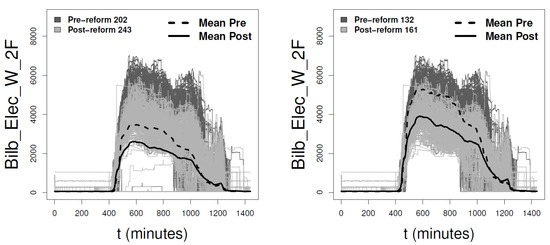 Generally, monitored lighting consumption data after retrofitting have less dispersion (see △Var in Table 2). This means that the monitored lighting data are more homogeneous. In this case, the reduction of the data variability reaches values higher than 30% from both methods. However, the functional analysis detects an increase of 17% in the data dispersion of the third floor, as shown in Table 2. The functional graph of this floor in Figure 5 supports this result. The vectorial approach, which summarises the days with the mean, distorts the results by considering false conclusions such as, in this case, that the data variance decreased for all floors (see Table 2). On the other hand, the homogeneity of the monitored illuminance data after the renovation is different depending on the floor. Table 3 shows that the floors where the data dispersion was reduced are the ground and the second floors.