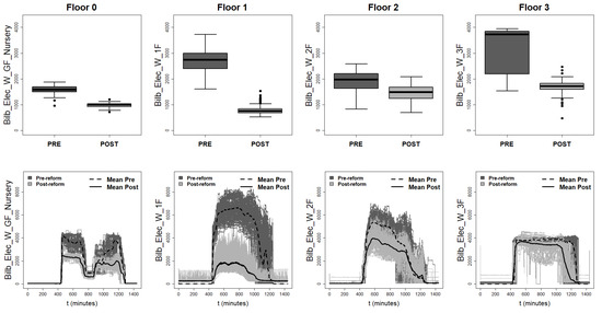 Analysis of the electrical lighting consumption on each floor measured in W. In the first row, the vectorial results (in form of box plots) are presented. In the second row, instead, the functional data are represented with the respective mean functions. The data are divided into winter days before and after the refurbishment.