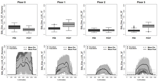 Analysis of the illuminance on each floor measured in lx. In the first row, the vectorial results (in form of box plots) are presented. In the second row, instead, the functional data represented with the respective mean functions. The data are divided into winter days before and after the refurbishment.
