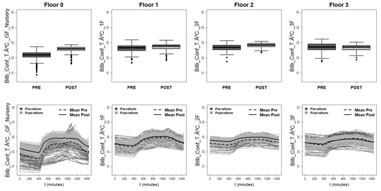 Analysis of the temperatures on each floor measured in °C. In the first row, the vectorial results (in form of box plots) are presented. In the second row, instead, the functional data are represented with the respective mean functions. The data are divided into winter days before and after the refurbishment.
