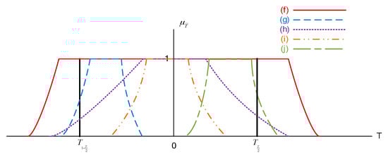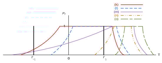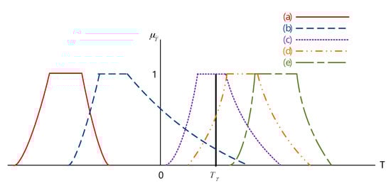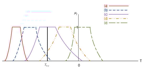When all fuzzy data reduce to crisp values, Equation (5a,b) become identical and reduce to in the classical model. Using Zadeh’s extension principle [34], the membership function may be constructed as