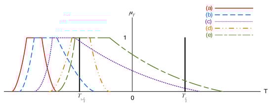 The two-sided test involves fifteen different types of membership functions of , as shown in Figure 5, Figure 6 and Figure 7, where the crisp set is the rejection region. The definition of possibility is shown in Table 3.