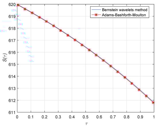 where only are unknowns. Putting these values of S, I and R into the main Equation (1) and using the collocation points , where , we can get the system of non-linear algebraic equations with number unknowns. By solving these equations with the avail of the Newton iteration method by MATLAB software, we can ascertain the unknown Bernstein coefficients. By superseding unknown coefficients into Equation (21), we may obtain the desired solutions.