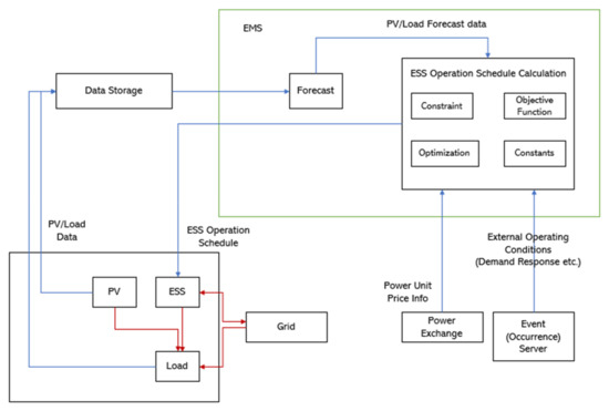 The red arrow in the system diagram (Figure 1) indicates the supply of power whereas the blue arrow is showing the flow of information. The system largely consists of a Micro Grid, power grid, power exchange and event-generating server. The variables used to explain the supply of power in the diagram are as follows: It is assumed that all kinds of powers in each time zone are constant and the time interval is one hour. Although both energy management system (EMS) and data storage belong to the Micro Grid, the Micro Grid, in this case, is one that consists of new and renewable energy sources, loads and energy storage. There are a number of new and renewable energy sources such as photovoltaic (PV) and wind turbine (WT) but only PV was indicated for convenience. The power produced by PV will be stored in the ESS or consumed by the load. Also, PV/Load data are used to predict the future PV/load value after being stored in data storage.