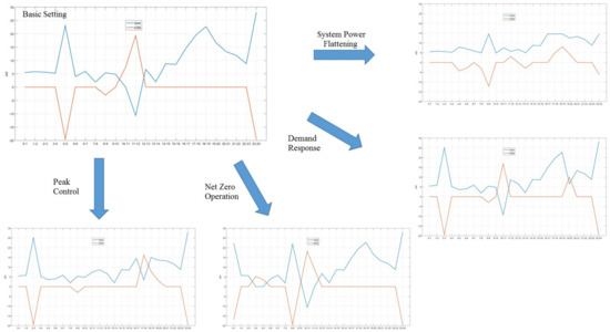 The results above showed that all the equations were effective in every case and it can be confirmed that all the ESS operating schedules, except net zero energy operation, had been adjusted in such a way that power is charged during the daytime and discharged or sold when the power cost was highest.