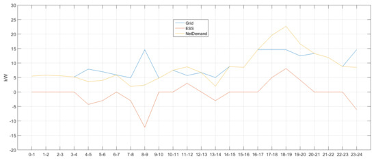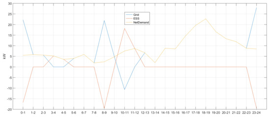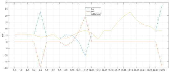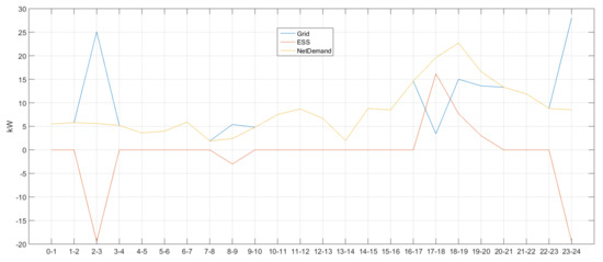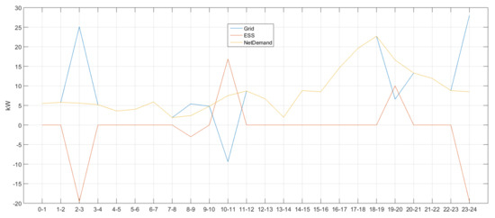 In Figure 4, there was no charging/discharging in time zones 0–1 and 1–2 as the ESS values were 0. In addition, power demand and supply were balanced as net demand = grid was achieved (i.e., overlapping blue and yellow lines). It can be deduced that ESS has been charged as the sign was (−) in time zone 2–3. In this case, the (+) grid sign means that power was purchased from the system. Power demand and supply were balanced (net demand = grid) in time zones 3–4, 4–5, 5–6, 6–7 and 7–8 where there was no charging/discharging activity. The (+) grid sign and (−) ESS sign in time zone 8–9 indicate that power was purchased from the system to charge ESS. Next, no ESS charging/discharging was performed in time zones 9–10, 10–11, 11–12, 12–13, 13–14, 14–15, 15–16 and 16–17 and power demand and supply were balanced, thus satisfying net demand = grid. The same can be said for time zones 20–21, 21–22 and 22–23, but ESS was charged in time zone 23–24 as its sign was (−), buying power from the system.