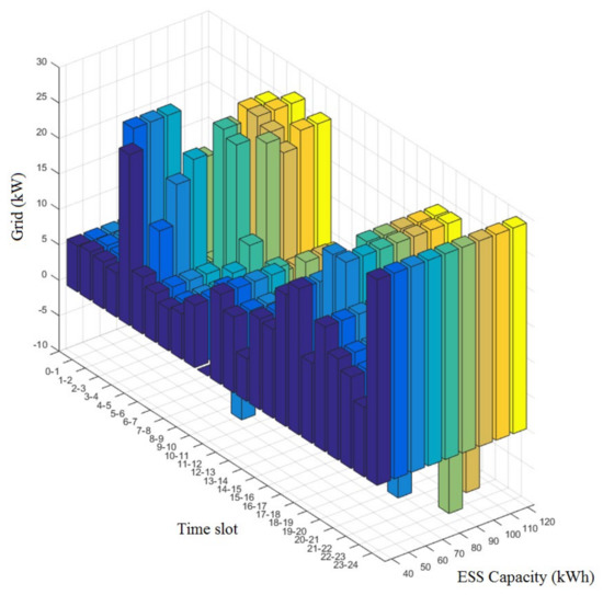 Observing time zones 4–5 and 8–9 in Figure 8, Figure 9 and Figure 10, it is possible to recognize the tendency of increasing system power usages in proportion to the ESS capacity. This would mean that the grid is pursuing an economic gain by charging its ESS when the power unit cost is low and selling or reducing its purchase during the time zones when the cost is high.
