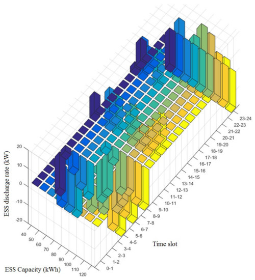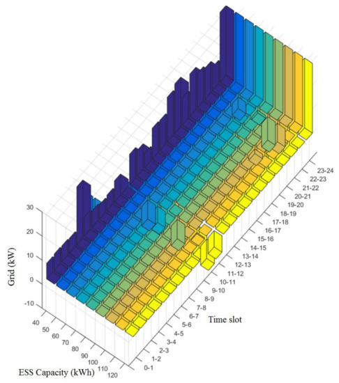Figure 9, Figure 10, Figure 12 and Figure 13 are the pictures of Figure 8 and Figure 11, respectively, when viewed from other angles. The vertical axis in Figure 8, Figure 9 and Figure 10 indicates the system power usages (Grid), whereas the same axis in Figure 11, Figure 12 and Figure 13 is the ESS charging(-)/discharging(-) power. A long axis, “Time Slot,” shows the time zones, with “ESS Capacity” indicating the capacity of the ESS. The bar3 function of MATLAB R2015a was used for graphing.