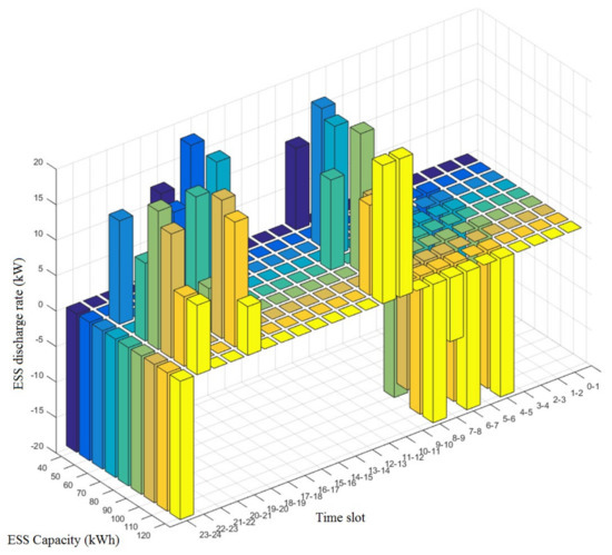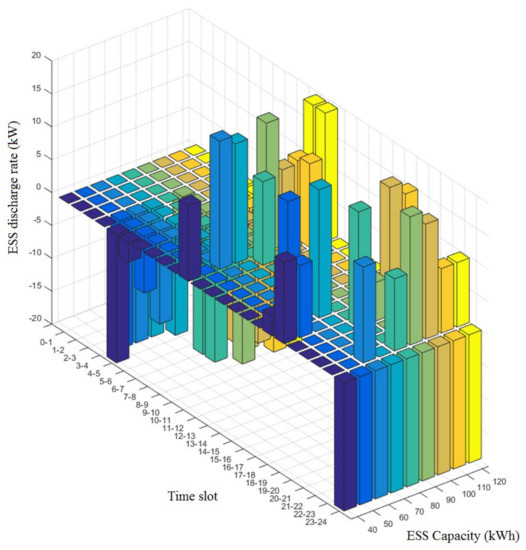 As such, Figure 7 also shows that the ESS was charged in time zones 0–1, 8–9 and 23–24 when the power unit cost was low (66.1) and discharged in time zone 10–11 when the cost was high (111.3) to achieve net zero operation. The system power usages obtained from a simulation conducted by changing the capacity of ESS from 40 to 120 kW (+10 kW per simulation) are shown in Figure 8, Figure 9 and Figure 10 and their discharging powers, in Figure 11, Figure 12 and Figure 13.