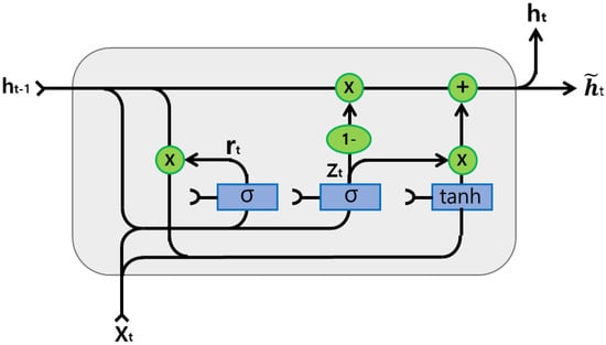 In Equations (1)–(4), the matrices , , and are the input weighted matrices, and , , and are the recurrent weight matrices. The vectors and are the bias vectors. The function is the activation function. Figure 1 shows the structure of GRU.