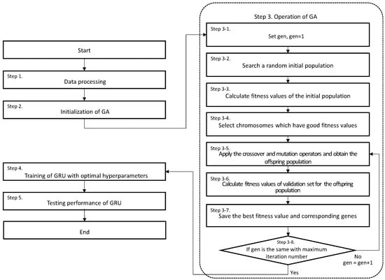 In Step 1, the dataset is normalized and then divided into three main datasets, training (70% of the dataset), validation (10% of the dataset), and test (20% of the dataset). In Step 2, the parameters of GA are initialized. In Step 3, GA searches hyperparameters and applies them to train a GRU model with the training set. While training a GRU model, we use mean squared error (MSE) as a loss function. Then, using the validation set, GA calculates a fitness function with the current hyperparameters. Equation (7) denotes the function of MSE.