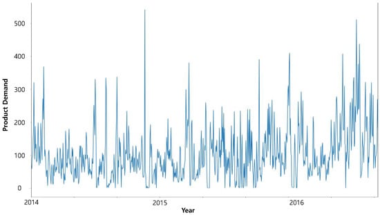 To check the performance of GA-GRU, we performed three experiments. The first experiment was to compare GA-GRU with other models, such as ARIMA, ANN, RNN, and GA-LSTM. The second experiment was to test k-fold cross validation. The third experiment was the sensitive analysis of the GA parameters. We took a Brazilian top retailer’s sales dataset, which included the customers’ daily product demand, from January 2014 to July 2016 (Retail Sales Forecasting, https://www.kaggle.com/tevecsystems/retail-sales-forecasting) as an example. The dataset was divided into three subsets: training set (70%, 564 observations), validation set (10%, 81 observations), and test set (20%, 162 observations). Because the dataset was daily demand data, 1-day-ahead (one-step-ahead) forecasting was performed. Figure 3 shows the time-series graph of daily product demand.