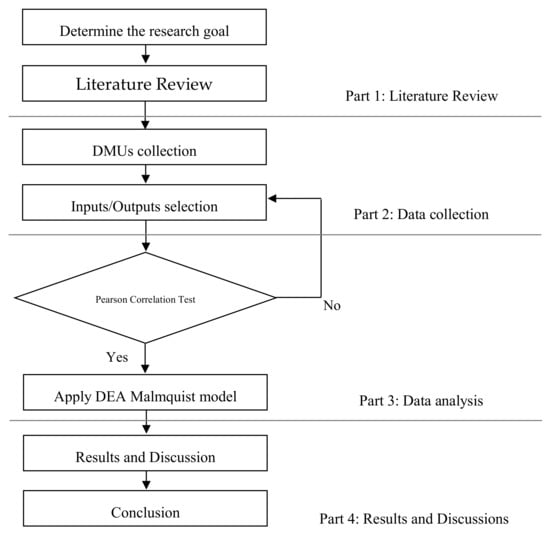 In this research, the authors deployed the Malmquist productivity index model in the DEA method, to evaluate the performance of the world’s top 20 automakers from 2015 to 2018. The study includes four parts of processes, as shown in Figure 1.