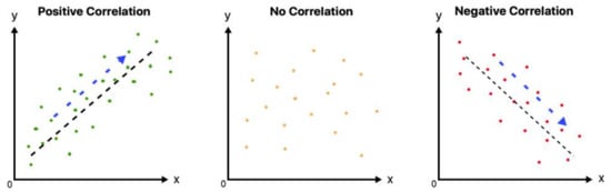 The Pearson correlation is widely used in many research studies; it was developed by Karl Pearson and published by Auguste Bravais in 1844. It has a value between −1 and +1, representing the linear dependence of two variables or sets of data, where +1 is total positive linear correlation (when one variable increases in value, the other variable will also increase), 0 is no linear correlation (there is no association between the two variables), and −1 is total negative linear correlation (when one variable increases in value, the other variable will have a decrease in value), as illustrated in Figure 2.