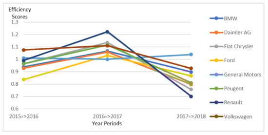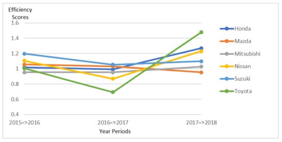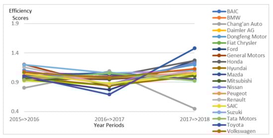 In the period of 2015–2016, most of the DMUs performed inefficiently, with the MPI less than 1, only five automakers, namely General Motors (G.M.), Nissan, Suzuki, Toyota, and Volkswagen, achieved progress in total factor productivity.