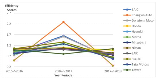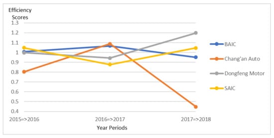 This study illustrates the results of technical efficiency, technological progress, and the total factor productivity of automakers in the four-year periods. Findings show that, after a period of slight decline, most manufacturers have gradually improved their technical efficiency, which somehow leads to technical progress. Suzuki turned out to be the best and most stable manufacturer in terms of technical efficiency, while Chang’an Auto needs more improvement in this aspect. In terms of technological progress, most manufacturers have an unstable performance, especially the Chinese automakers. This regress in performance is also noticed in the study conducted by Imran et al. [] wherein the export performance of Chinese automotive sector is the main scope. Exportation of automobile units affects the revenue and income of the company in which this paper uses as variables.
