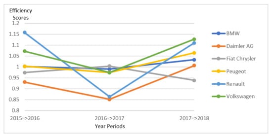 Like Japanese automakers, European carmakers also tended to improve their performances after the previous decline. Only one automaker, Fiat Chrysler (D6), showed a degradation in technical efficiency, as seen in Figure 6.