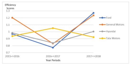 Figure 7, below, shows the remaining four manufacturers, Ford, General Motor (from the US), Hyundai (from Korea), and Tata Motors (from India) exhibiting less-significant changes in technical efficiencies.
