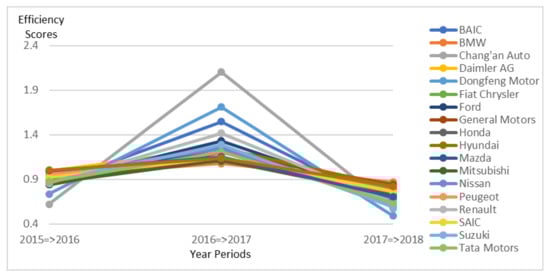 It can be observed in Figure 8 that the automobile manufacturers did not achieve technological progress during the period of 2015–2016. Only D20 (Volkswagen) obtained a frontier-shift index greater than 1, indicating that the development in technology and innovation of the global auto industry have not improved very well and have many limitations. After a period of poor technological performance 2015–2016, manufacturers opted to invest in technology innovation and achieved technological efficiency in the period 2016–2017, especially D1, D3, D5, D7, D10, D11, D15, and D17. However, because technology development has been so fast and developing, manufacturers failed to maintain progress and even severely declined in the next period.