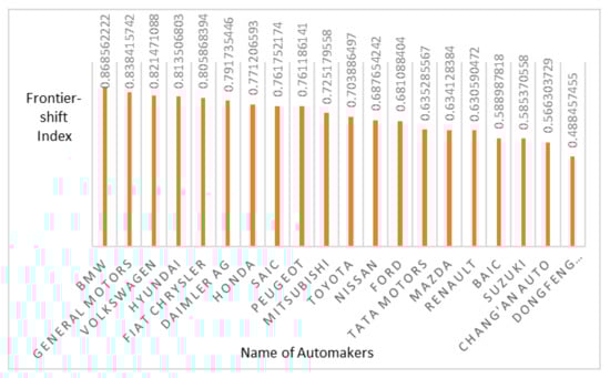 Figure 9, below, shows the frontier-shift scores of automobile manufacturers in the period of 2017–2018. During this period, the manufacturers with low efficiencies (F < 0.6) were Dongfeng, Chang’an Auto, BAIC (manufacturers from China), and Suzuki (Japan). Manufacturers such as Renault, Mazda, Tata Motors, Ford, and Nissan also had a low performance (F < 0.7). BMW, General Motors, Volkswagen, Hyundai, and Fiat Chrysler had better technological efficiency than the rest, with F > 0.8. Thus, it can be seen that, in this period, manufacturers from Asia, especially China, had a more serious decline in technological efficiency than European and American automobile manufacturers. The simultaneous decline in technological efficiency of all 20 automobile manufacturers shows a close correlation with the decline in global automobile production in this period of 2017–2018.