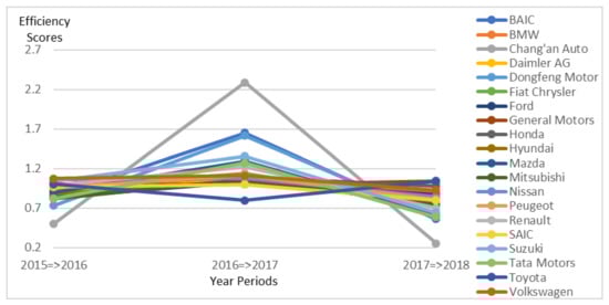 However, the manufacturers could not maintain this progressive performance for the next period, 2017–2018. The productivity scores of automakers even declined very badly, having an average value of only 0.762. The lowest index of 0.2536 belongs to D3 (Chang’an Auto), meaning that it was the least-efficient producer at this period. The two occasional outstanding automakers that achieved a good performance in this period were D8 (General Motors) and D19 (Toyota), with the MPI equal to 1.0383 and 1.0416, respectively.