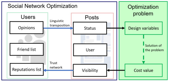 The population of the algorithm is composed by users of the social network who interact online by publishing some posts. In fact, at each iteration, the users express their opinions by means of the status contained in the post. In addition to this information, the post contains the name of the user that have posted it, the time at which it is posted, and a visibility value. The process of passing from opinions to a post status is called linguistic transposition.