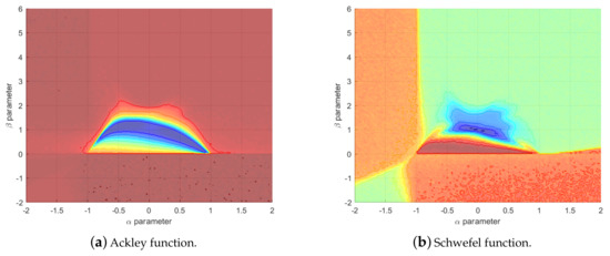 The parametric analysis on the parameters and has been performed on two standard benchmarks for EAs: the Ackley and Schwefel functions. The termination criterion is set to 5000 objective function call and 50 independent trials have been done on 20D functions. Figure 3 shows the results of the parametric analysis: the color is proportional to the cost value, where red is high cost and blue low cost. The results show that the high quality solutions area is different, but it is possible to find a good set of parameters for both the functions. In particular, the selected set of parameters is and .