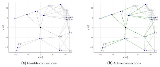 The feasible connections are bidirectional if they involve only sensor nodes, while are considered monodirectional if one of the two nodes is the cluster head, as shown in Figure 4a, where the directed connections are indicated with the arrow.