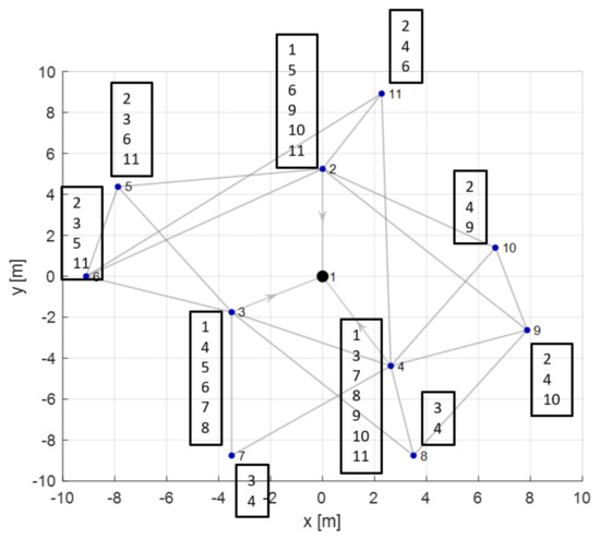 WSN with 11 nodes in which, for each node, its adjacency list is defined.