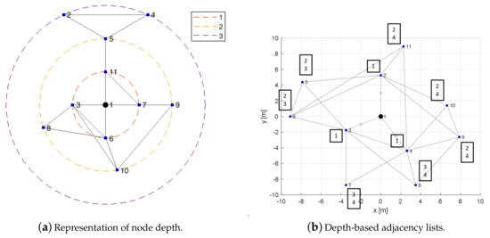 WSN with 11 nodes: (a) the node depth is underlined with the circles; and (b) to each node its depth-based adjacency list is defined.