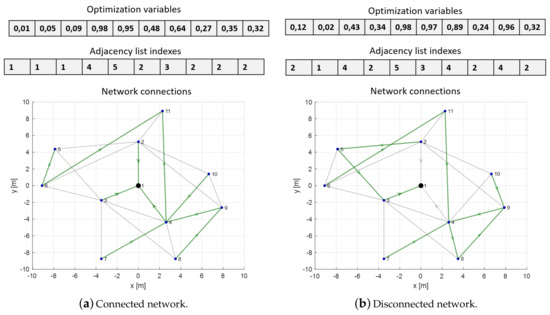 Example of the decodification of the optimization variables: (a) feasible network; and (b) disconnected network.