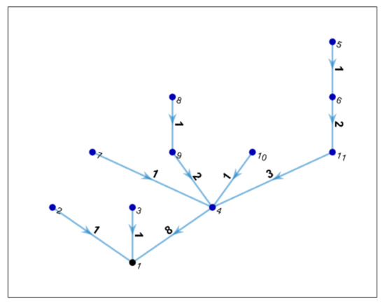 If the network is feasible, the calculation of the cost is run. The first activity performed is the estimation of the information packages through each node. This is computationally performed in the graph represented by the active connections by means of a customized search that starts from the deeper nodes and then goes upward. Each node creates one information package and forward the received ones. Figure 8 shows the transmission packages for each edge.