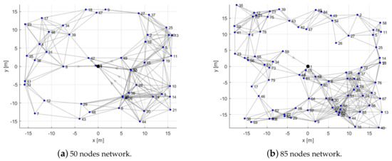 Figure 7 shows the decodification of two different sets of optimization variables: in the first one (Figure 7a), the resulting network is connected, while, in the second one (Figure 7b), it is not and, thus, the solution is unfeasible.