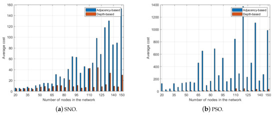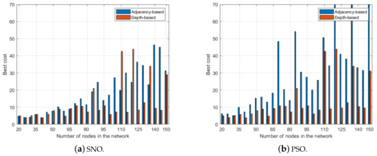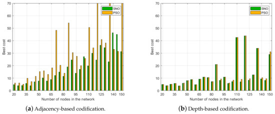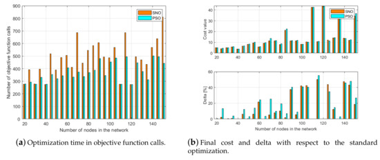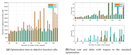 Best cost value of 50 independent trials as function of the number of nodes in the network: (a) results of SNO; and (b) results of PSO.