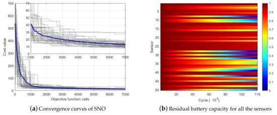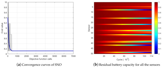 SNO optimization of the 50-nodes network with the depth-based codification: (a) convergence curves; and (b) residual battery capacity.