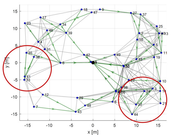 The active paths of the optimal solution are shown in Figure 17 with the green lines. In this figure, two areas have been highlighted. The red circles underline some sub-optimal configurations of the network: for example, in the left one, node 41 hops on 36 that hops on 33 that send all this information to sensor 35. This is sub-optimal because all these nodes could be connected directly to node 35.