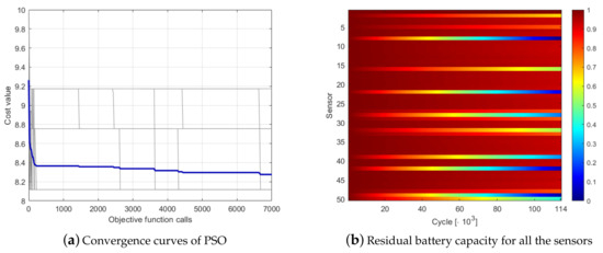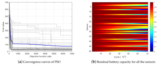 PSO optimization of the 50-nodes network with the depth-based codification: (a) convergence curves; and (b) residual battery capacity.