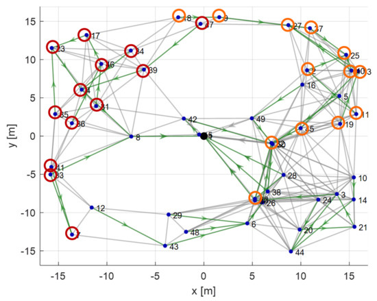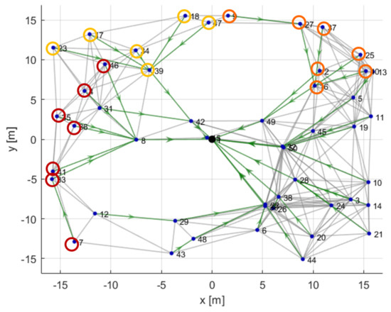 The overload of these nodes can bee seen from the optimal solution obtained with the depth-based codification shown in Figure 22. The colored circles underline the cluster of nodes that transmits through the highly loaded nodes. In particular, the red circles belong to the cluster of node 8, the yellow ones to sensor 42, and the orange ones to node 49.