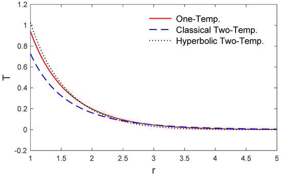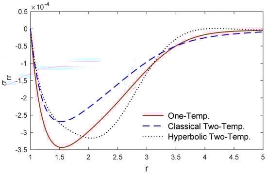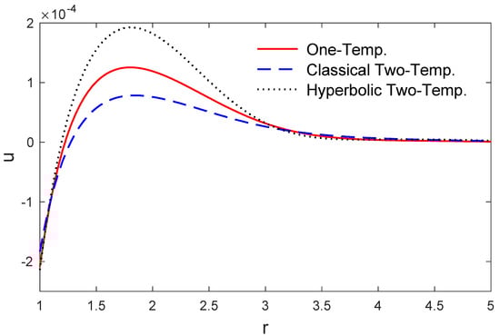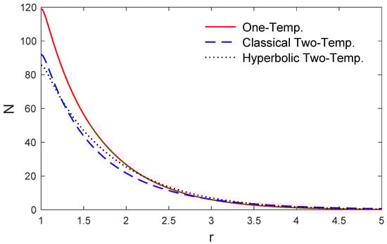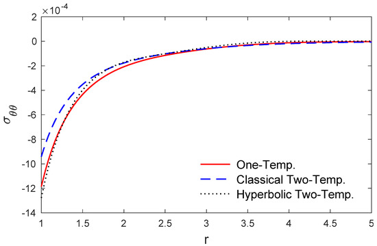 where is the term numbers. Based on the Laplace transform’s inverse and the above set of constants, the calculations of physical variables with respect to the redial distance under one temperature, classical two-temperature and hyperbolic two-temperature are presented in Figure 1, Figure 2, Figure 3, Figure 4, Figure 5 and Figure 6. The variation of conductive temperature, the variation of thermodynamic temperature, the variation of radial displacement, the variation of carrier density, and the distributions of radial and hoop stresses along the radial distance under the coupled photothermal theories are calculated numerically. Figure 1 displays the variations of conductive temperature versus the radial distance . It is clear that the conductive temperature has maximum value at the boundary , after that it progressively decreases with the increasing of the radial distance to eventually come to zero. Figure 2 shows the thermodynamic temperature variations versus the radial distance . It is observed that it starts from the highest values at the boundary and decreases with the increasing of the radial distance until it reaches zero for sufficiently large values of . Figure 3 explains the carrier density variations with respect to the radial distance r. It is clear that the density of the carrier begins with its highest values at the boundary , then it progressively decreases with the increasing of the redial distance r until it comes to zero. Figure 4 depicts the variations of radial displacement versus the radial distance r. It can be observed that the displacement attains a maximum negative value then it increases progressively up to peak values in a particular location proximately close to the surface, and then decreases to zero. Figure 5 shows the variations of radial stress with respect to the redial distance r. It is noticed that the radial stress, permanently begins from zero and drops to zero to obey the boundary conditions. The hoop stress variations versus the radial distance is shown in Figure 6. It can be noticed that the hoop stress attains a maximum negative value and then continuously increases to zero. Finally, in compression between the solutions, one can conclude that considering the coupled photothermal theory with thermal and conductive temperatures is an important phenomenon and has a great effect on the distribution of field quantities.