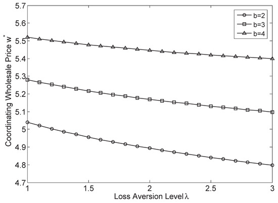 Figure 1 and Figure 2 illustrate the effects of loss aversion on the order quantity and coordinating wholesale price, respectively. As shown in these two figures, for any given buyback price b, the order quantity and coordinating wholesale price decrease with loss aversion level. Figure 3 and Figure 4 illustrate that for any given purchase rate , the optimal order quantity and coordinating wholesale price also decrease with confidence level, i.e., the higher the loss aversion or confidence level is, the lower the order quantity and coordinating wholesale price are. These results are in accordance with Corollaries 1 and 3. When the loss aversion or confidence level increases, the retailer becomes more conservative and will select a smaller order quantity to hedge against the potential loss or risk that comes from the possible excess order. Thus, the manufacturer must decrease the wholesale price to induce the retailer to enhance order quantity. Figure 1 and Figure 2 (Figure 3 and Figure 4) also show that the buyback price (purchase rate) affects the sensitivity of optimal order quantity and coordinating wholesale price when loss aversion level (confidence level) changes. For instance, the optimal order quantity when decreases more rapidly than that when in Figure 1. This indicates that for lower buyback price, the change to loss aversion level has larger effect on the order quantity. In addition, Figure 1 implies that the order quantity maximizing CVaR of utility (i.e., ) is less than that maximizing CVaR of profit (i.e., ). Figure 3 implies that the order quantity maximizing CVaR of utility (i.e., ) is less than that maximizing expected utility (i.e., ). Please note that according to Corollaries 1 and 3, the monotonicity of both the optimal order quantity and coordinating wholesale price are independent on the demand distribution and parameter values. Similarly, according to Corollary 2, the relation between the optimal order quantity maximizing CVaR of utility, maximizing CVaR of profit and maximizing expected utility are independent on them as well.