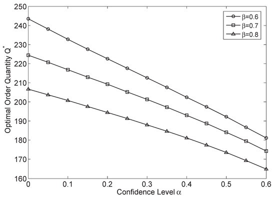 As mentioned above, the retailer’s CVaR objective of utility is the expected utility when . In such a case, reduces to the optimal order quantity that maximizes expected utility that is often studied in the supply chain models with loss-averse decision makers (e.g., [21,22,23]). Denote it by and then from (9) it satisfies